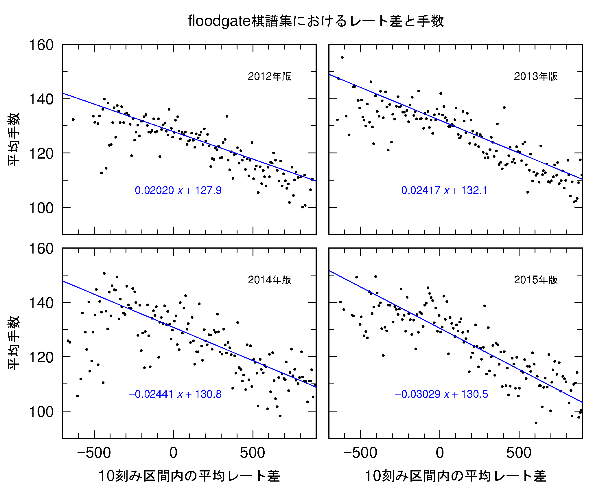 次に回帰直線の方に注目すると、棋士棋譜集の解析においては、\[T = -0.02403 dR + 115.8\]という結果でした。今回の結果は、年ごとのばらつきはあるものの、傾きはおおよそ近い値になっています。不思議なことに、レート差100ごとに手数が2.5手くらい変わるというのは、棋士もコンピュータも同じ傾向にあるようです。これが偶然の一致なのか、それとも何らかの機構に由来するものなのかは、このデータからだけでは分かりません。また、レート差がない時(dR = 0)の手数は、floodgate棋譜集の方がおおよそ15手くらい大きくなっており、この結果は「手数と投了 4:floodgateにおける投了手数」の結果と整合しています。