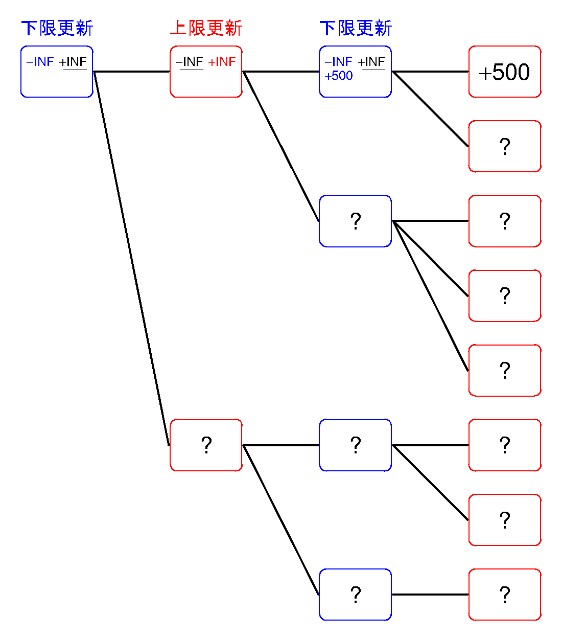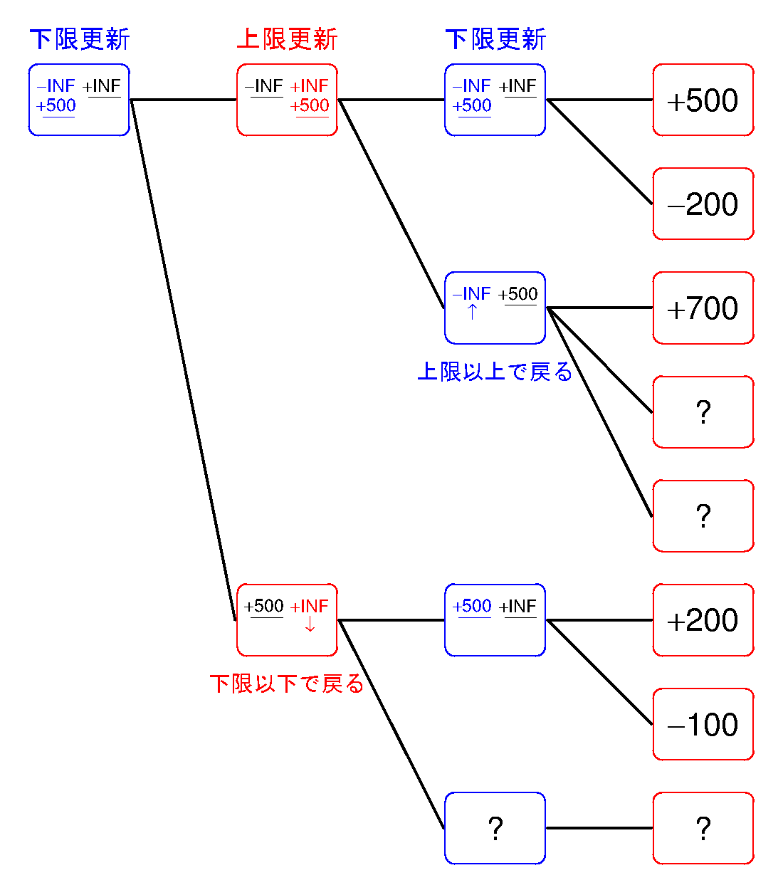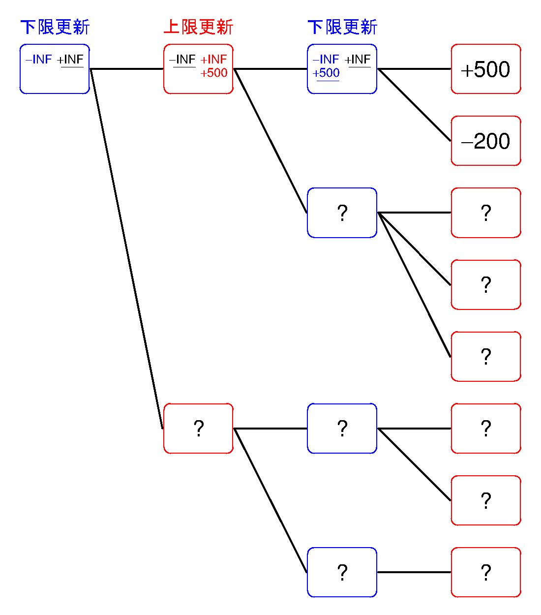 図中の各ノードには下限値と上限値が並べて書いてあり、確定値には下線を引きます。探索によって、下線のない数値を更新していくというのが基本的な作業になります。