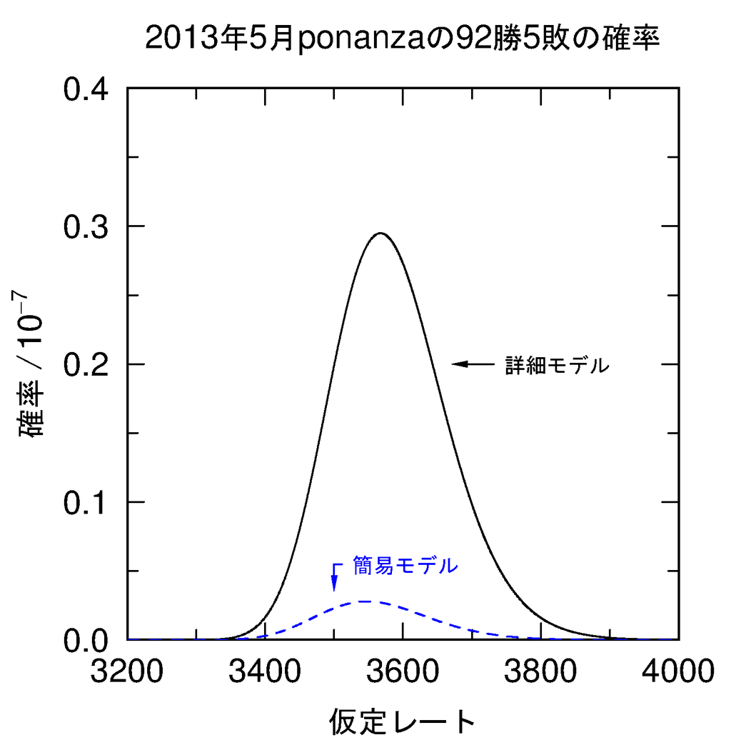 それでは、2013年5月の記録ではどうなるでしょうか? この時には92勝5敗ですので、最も確率が高くなるレートが存在するはずです。