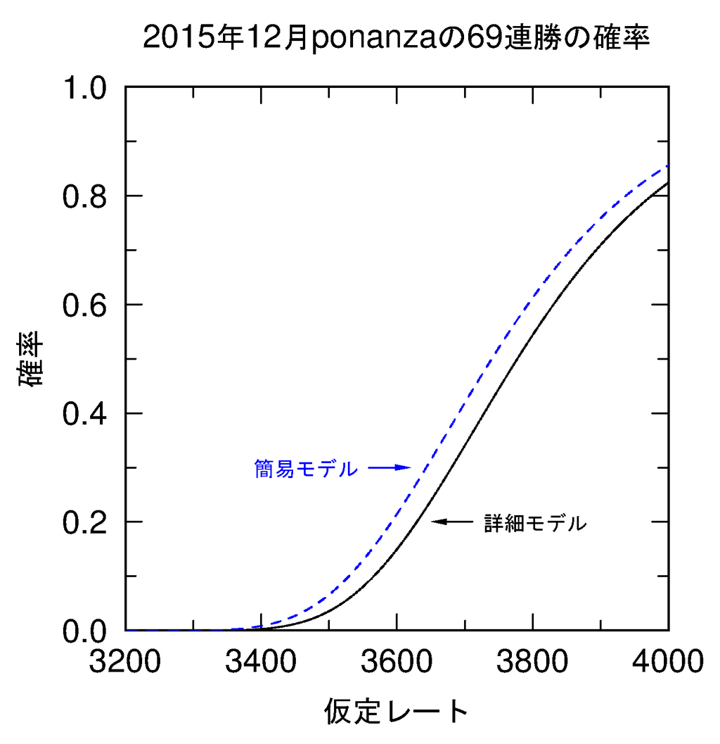 69連勝する確率を算出する際には、ponanzaのレートの仮定値の他に、モデルを設定する必要があります。記録をそのまま用いると、以下の「詳細モデル」になります。